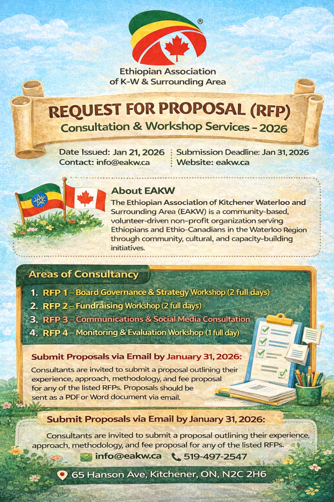- Request for proposal📢 Request for Proposals (RFP) – Consultation & Workshop Services (2026) The Ethiopian Association of Kitchener-Waterloo & Surrounding Area (EAKW) is inviting qualified consultants and facilitators to submit proposals for… Read more: Request for proposal